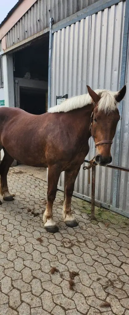 Fiona ist nicht nur der Name unserer mobilen Pferdewaage – sie ist das Herzstück unseres Betriebs. Die heute fünfjährige Noriker-Stute begleitet uns bereits seit ihrem Fohlenalter und hat sich von einem aufgeweckten Jungpferd zu einer zuverlässigen, sanftmütigen Partnerin entwickelt.